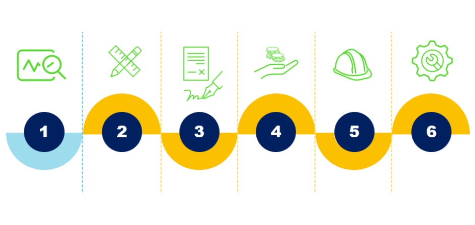 Nous vous accompagnons à chaque étape de votre projet. Voici les 6 étapes nécessaires à la réalisation d'un projet solaire :