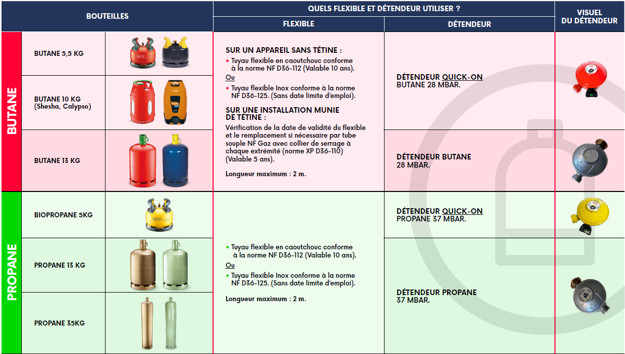 Voici un tableau récapitulatif pour vous aider à choisir le détendeur et le tuyau de gaz approprié en fonction de votre bouteille de gaz.